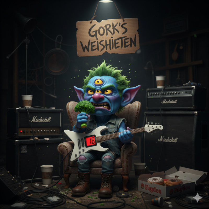 "Darf ich vorstellen? Das ist Gork. Mein persönlicher Blutzucker-Saboteur. Er ist blau, hat drei Augen und hält sich für den größten Rockstar seit Freddie Mercury. Leider spielt er seine Solos am liebsten in meinem Stoffwechsel. Hier postet er seinen täglichen Senf – lesen auf eigene Gefahr!"